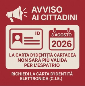 Si invitano i/le cittadini/e in possesso della carta d’identità cartacea a controllare la scadenza riportata sul retro del documento e, nel caso in cui la scadenza fosse successiva al 03 agosto 2026, a recarsi per tempo all’Ufficio Anagrafe per il rilascio della nuova carta d’identità elettronica.